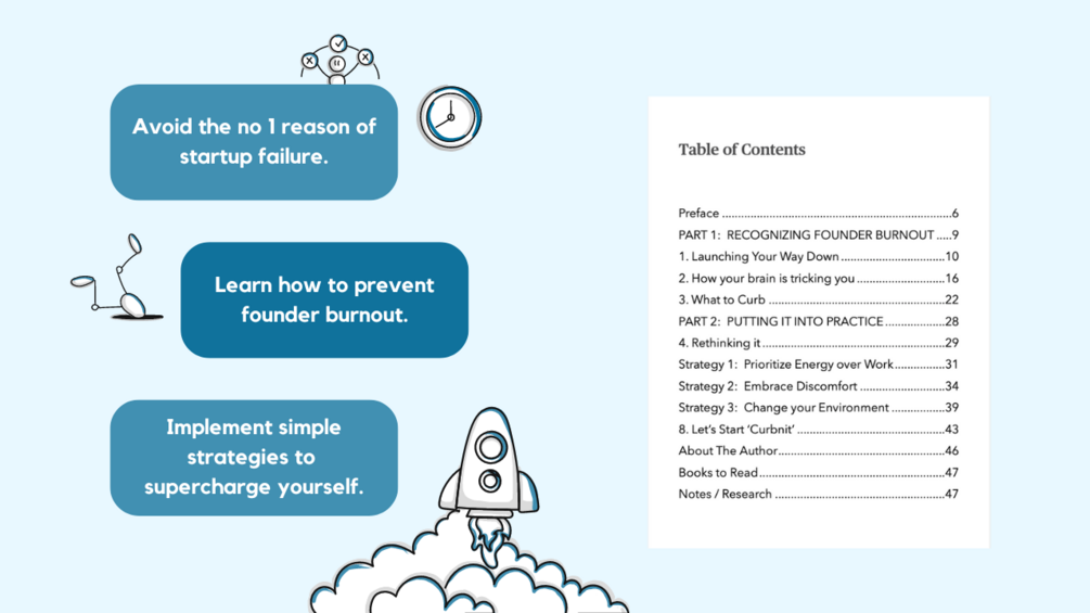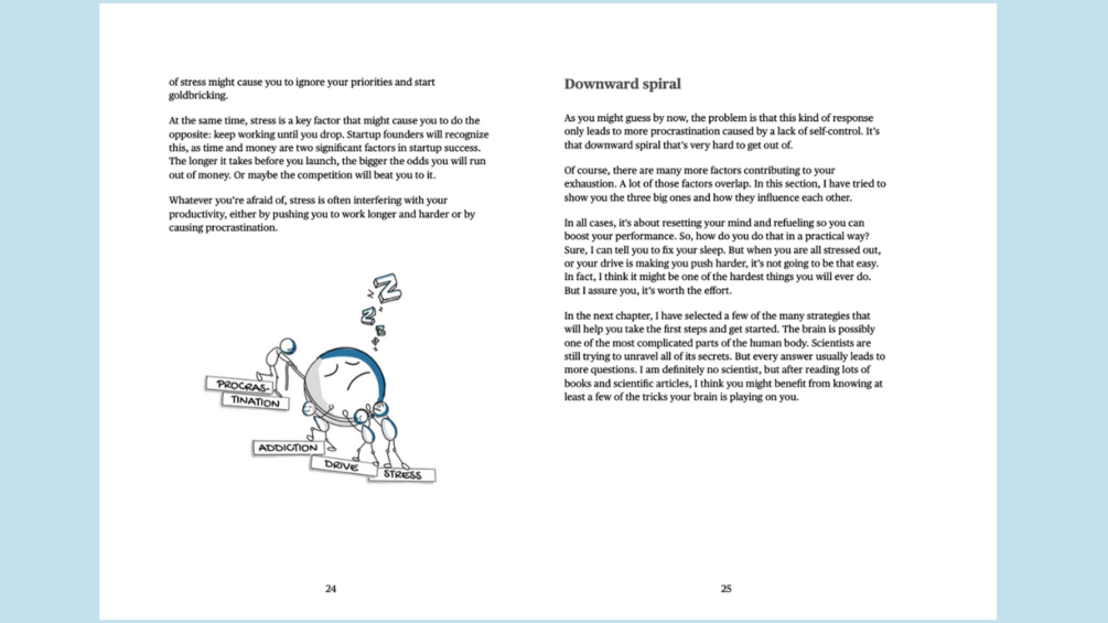 This book is about the real reason why so many startups and indie devs fail. Hidden behind all the data about running out of money and time, not finding product market fit and building the wrong team is one cause most founders are unaware of: founder burnout.